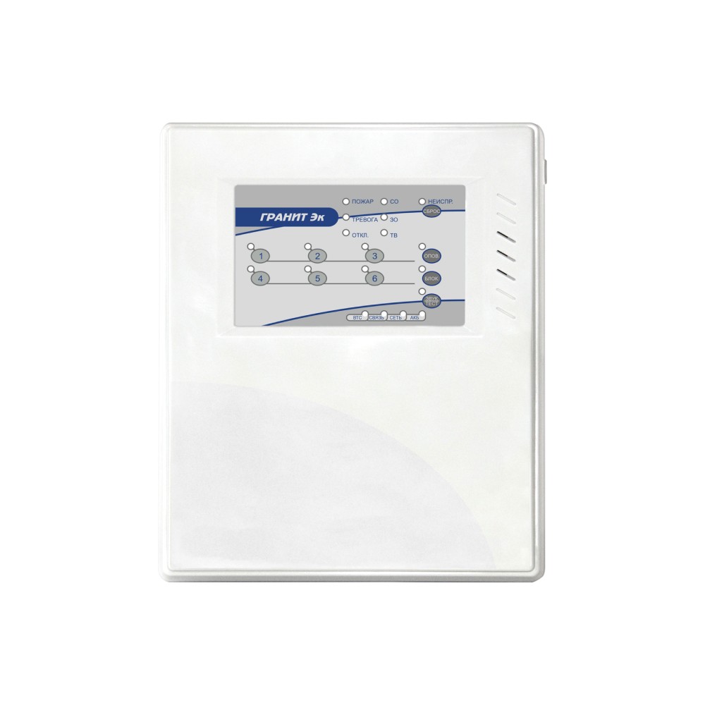 Контрольный прибор «Сибирский Арсенал» «Гранит-6 Эк» рассчитан на шесть шлейфов сигнализации. Укомплектован четырьмя реле. Оповещает о тревоге и других событиях с помощью световых и звуковых оповещателей, табло «Выход», контактами реле. Отвечает требованиям стандарта по электромагнитной совместимости ГОСТ Р 53325.