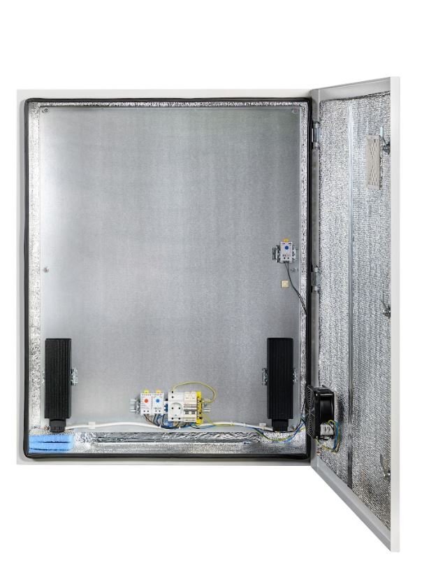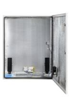 Предлагаемый навесной климатический шкаф оснащен монтажной платой и пятью гермовводами типа MG-25. Внутренние размеры шкафа составляют 777х977х270 мм (ширинахвысотахглубина). Шкаф обладает степенью защиты IP54 и диапазоном рабочих температур от -55 до +50°С. Внешние габариты: 800х1000х300 мм (ширинахвысотахглубина), вес - 46,3 кг. Цвет шкафа – серый.