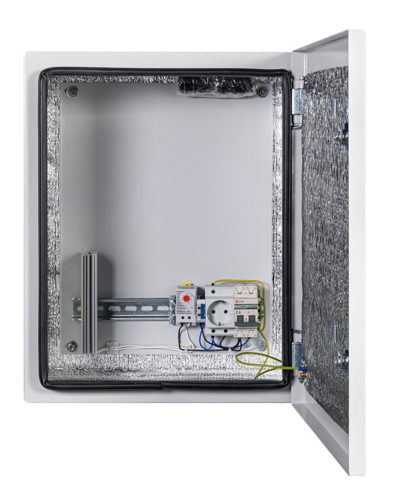 В комплекте: утеплитель из порилекса, замок 2 шт,ключ 1 шт, монтажная плата 1 шт, гермовводы 2 шт (MG-25), розетка 1 шт, автоматический выключатель, 6А 1 шт, клемма для подключения оборудования 2 шт, клемма заземления 1 шт, термореле 1 шт, нагреватель мощностью 75 Вт 1 шт.