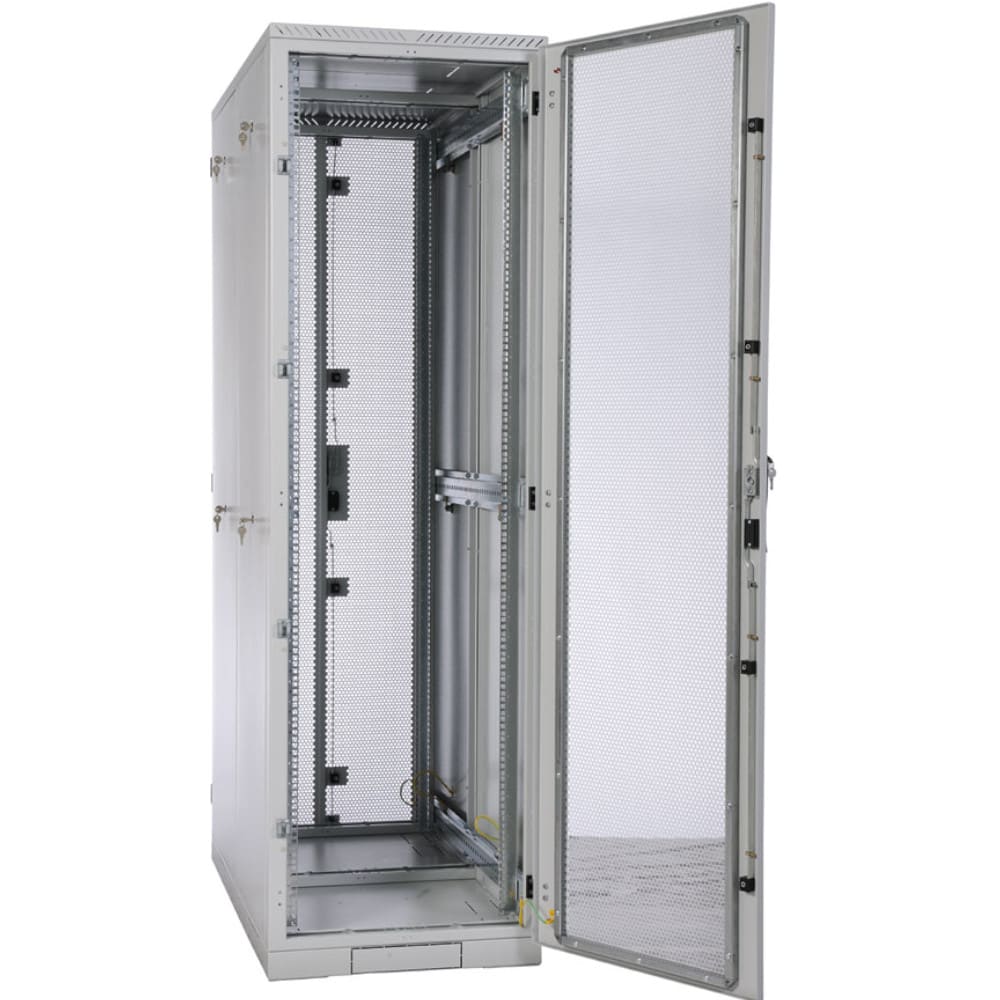 - Двери в передней и задней стенке — одинарные, перфорированные, угол открытия — до 180º, выбор стороны (левая/правая) навески, ригельные замки с ручкой (ключи в комплекте).