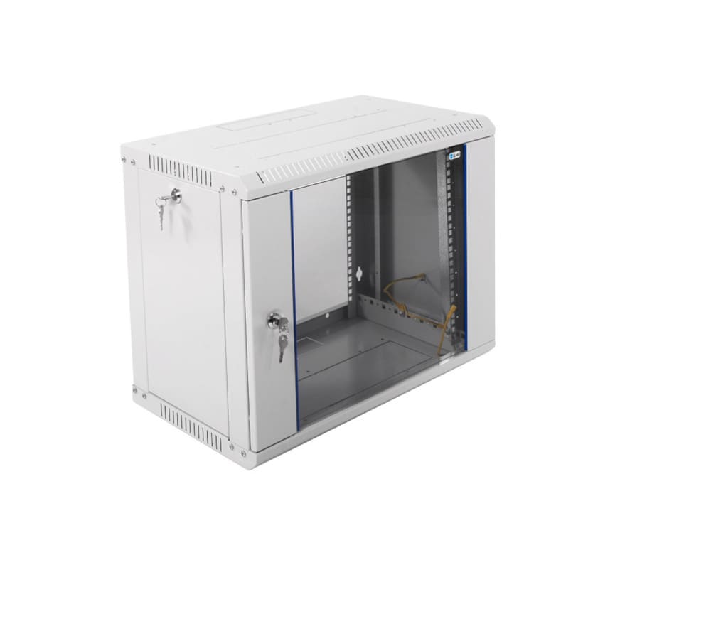 В состав шкафа входят: каркас, крыша и основание, две съемные боковые стенки с вертикальными направляющими, две передние направляющие и дверь универсальной навески со ударопрочным тонированным стеклом, которое открывается на 180°.