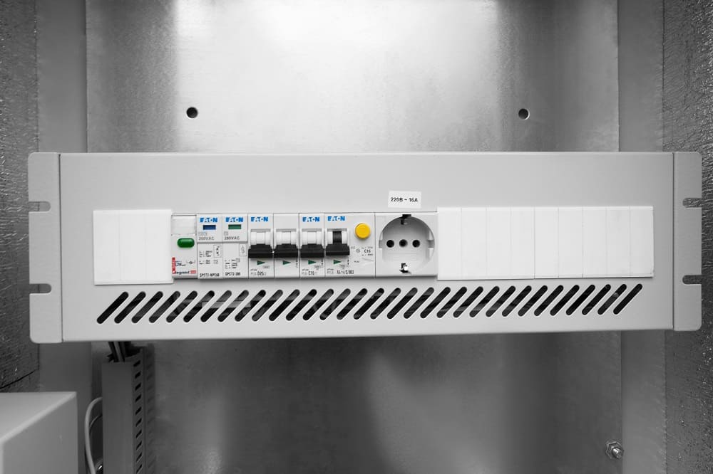 * Вводно-распределительный узел (ВРУ) с автоматическими выключателями, ограничителем перенапряжения, УЗО, индикатором напряжения и модульной розеткой.