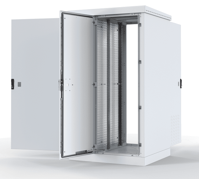 Предусмотрены два отсека — телекоммуникационный и электротехнический, посадочные места для обогревателя, вентиляторного модуля или кондиционера, отдельный отсек с двумя DIN-рейками для монтажа электротехнического оборудования, три двери универсальной навески, 10-сантиметровый цоколь. Опционально можно заменить заднюю дверь стенкой, цоколь — на 30-сантиметровый, выделить отдельную секцию под аккумуляторы, разделив полкой телекоммуникационную, установить антивандальные замки, подключить внешний источник питания, например генератор, через внешнюю розетку. Задняя стенка, полка, 30-сантиметровый цоколь, антивандальные замки и розетка не входят в комплект.