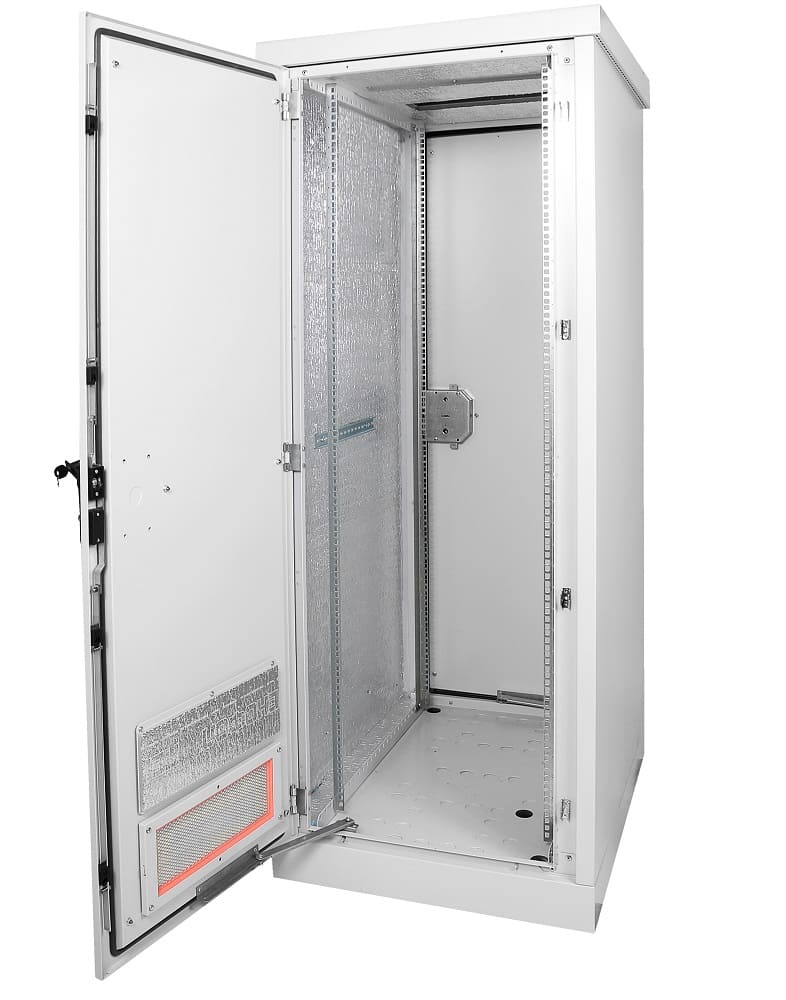 Корпус шкафа выполнен из оцинкованной стали толщиной до 2 мм и покрыт порошковой краской светло-серого цвета (RAL 7035). Шкаф обладает степенью защиты от влаги и пыли IP65, при установке вентиляторных модулей степень защиты снижается до IP54.