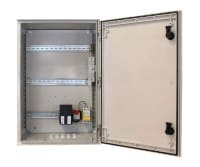 Термошкаф соответствует стандарту защиты от пыли и влаги IP66, рабочие температуры — –50 ºС... +50 ºС, предусмотрены гермовводы. Температура внутри шкафа — –15 ºС... +50 ºС. Питание — AC 100 ~ 240 В. Потребляемая мощность с учетом нагревателя — до 300 Вт. Отрезки на din-рейках, свободные для монтажа оборудования: верхний — 340 мм, средний — 320 мм, нижний — 170 мм. Размер — 400×600×230 мм.