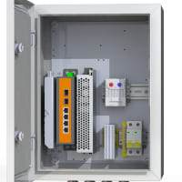 В состав шкафа также входит промышленный управляемый 4-портовый PoE-коммутатор с двумя SFP-слотами и консольным портом, оптический кросс с четырьмя SC-портами, четыре гермоввода PG9 и четыре PG13.5, две DIN-рейки и шина заземления.