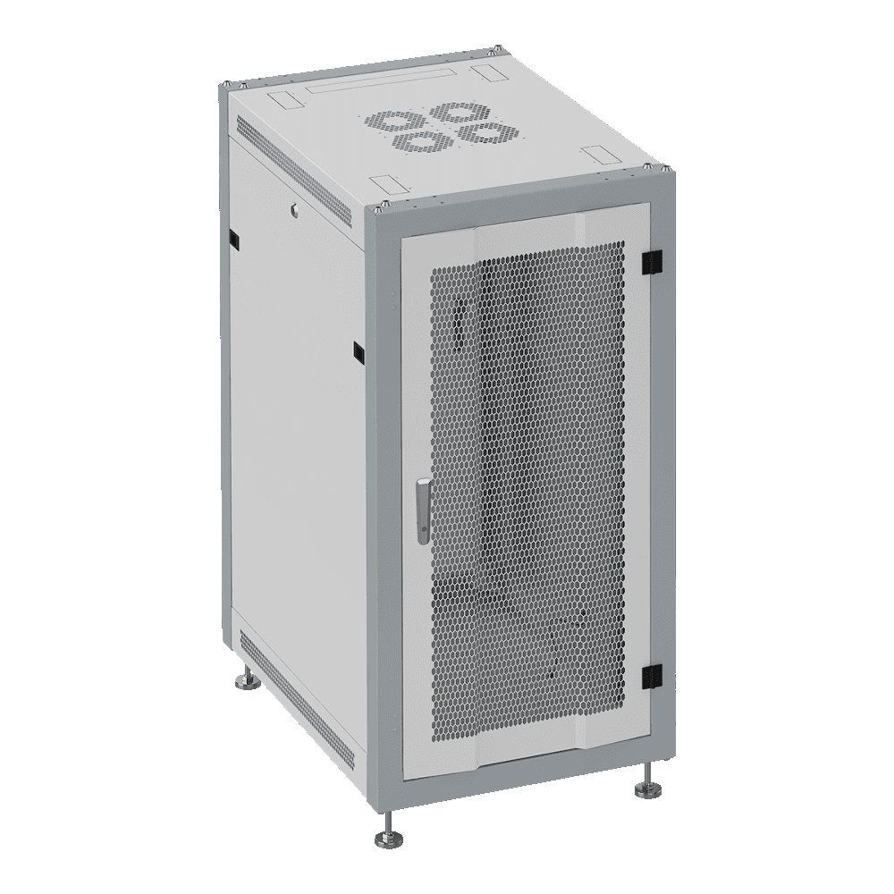 Шкаф оснащен перфорированной крышей и основанием для улучшения вентиляции. Дверные замки имеют поворотную ручку. В крыше предусмотрены заглушенные вентиляционные отверстия с решетками для установки вентиляционного оборудования или фильтров.
